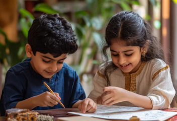 Kids doing calligraphy in playschool develop fine motor skills, creativity, and focus. It’s a fun way for them to practice handwriting and artistic expression.